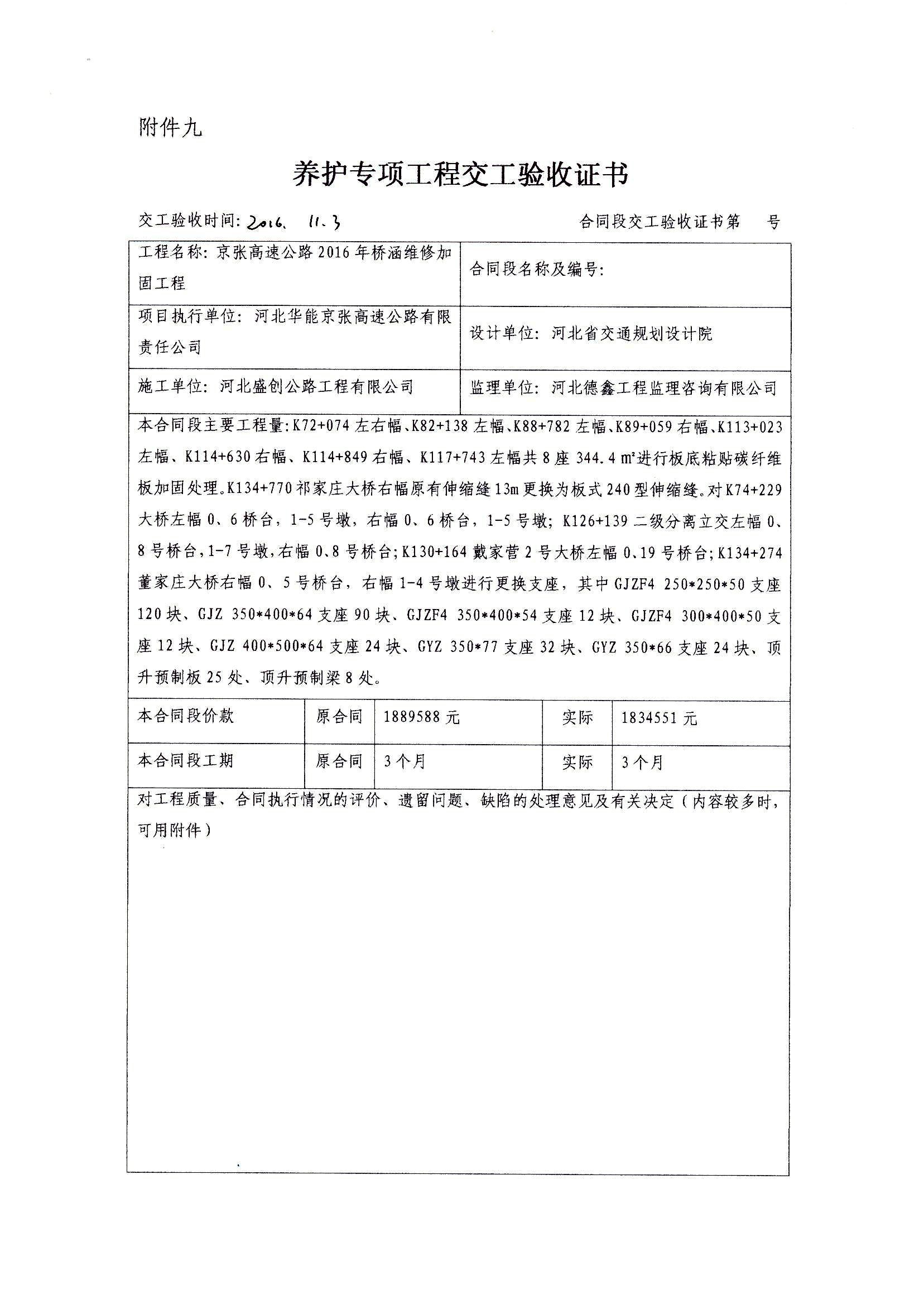 京張高速公路2016年橋涵維修加固工程交工驗(yàn)收證書
